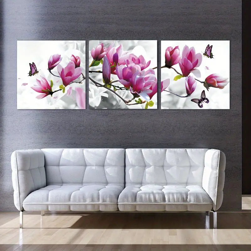 Transform your living space with our stunning 3-Piece Set of Unframed HD Printed Canvas Art, featuring exquisite designs of a pink butterfly and vibrant flowers. This modern and simple decorative painting is perfect for adding a touch of elegance and beauty to any room in your home, whether it's your living room, bedroom, or study room.